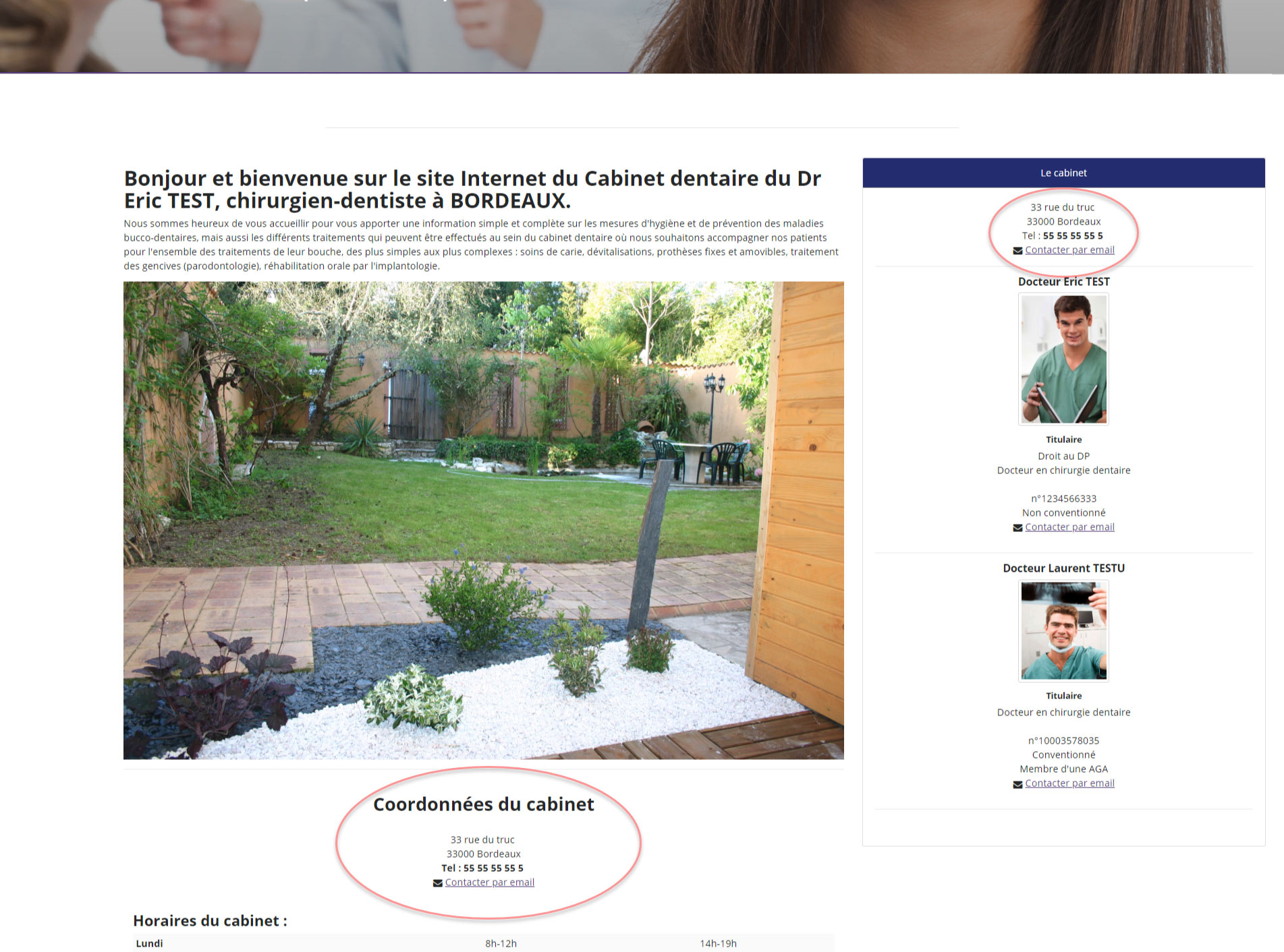 - Adresse postale et Téléphone/fax : Il est possible de les faire apparaître dans différentes parties du site :